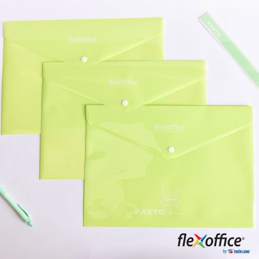 Logo Flexoffice và chữ PAZTO được in rõ nét trên mặt trước, tạo điểm nhấn nhận diện thương hiệu chính hãng Thiên Long. Mép bìa hàn phẳng, tinh tế, không ba via, kết hợp với bề mặt nhựa trơn sáng, hạn chế bụi bẩn và dễ vệ sinh.